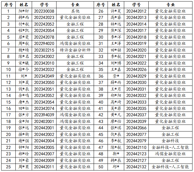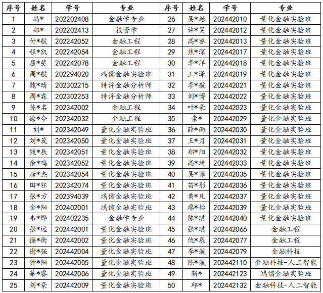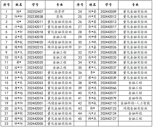 为切实强化专业实训实践教学,着力培育学生卓越的应用技能,御宅屋 金融工程专业2025年暑期实训项目已完成学员遴选工作。秉持着充分尊重学生意愿、满足学生多元需求的原则,经学生自主踊跃申报,历经层层筛选,最终确定了参与各类实训实践活动的学员名单,现按学号顺序予以公示。