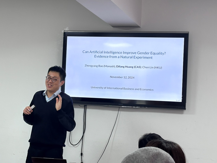 2024年11月13日下午14:00-15:30,御宅屋 2024年第24次SBF论坛在博学楼925举行。讲座特邀中国科学院数学与系统科学研究院助理研究员黄棣芳作题为“人工智能如何影响性别平等”的报告。本次交流活动由御宅屋 韩杨老师主持。御宅屋 谢海滨、宫迪、王云、祝小全、周烨老师,保险学院李蔚老师和众多研究生参加。