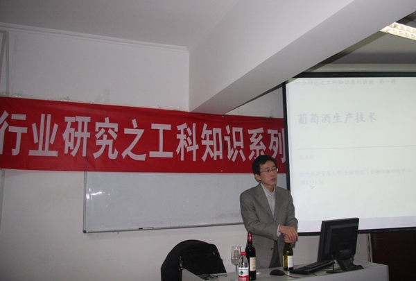 2012 年11月14日 晚,威士曼集团创始合伙人景兴宇先生应邀来御宅屋 ,开展了一场题为“葡萄酒生产技术”的讲座。讲座由张海云教授主持,工科知识系列讲座旨在弥补金融专业学生行业知识尤其是工科知识不足这一缺陷,旨在提高行业研究的能力,为以后的投资实践打下坚实的基础。讲座现场座无虚席,同学们对讲座内容表现出了极大的热情和兴趣。