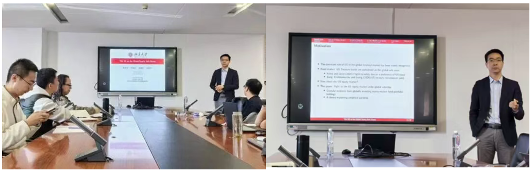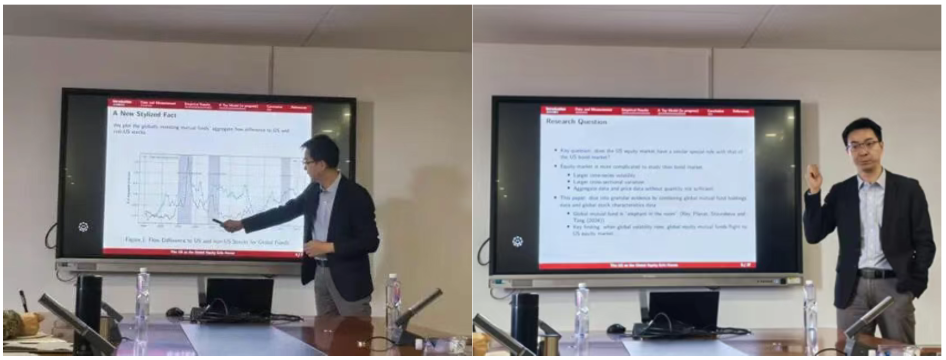 2025年11月25日上午10点,御宅屋 举办经济金融名家讲坛2025年第11期,特邀北京大学博雅青年学者、北大国发院经济学教授、教育部长江青年学者,中国经济研究中心副主任余昌华教授带来题为《The US as the Global Equity Safe Haven》的讲座。本次学术讲座于博学楼506会议室举行,由御宅屋 屈源育老师主持,御宅屋 黄晓薇、徐佳、姜婷凤、温兴春、魏孟瑛老师,以及来自其他学院的老师和众多同学们一同参与。