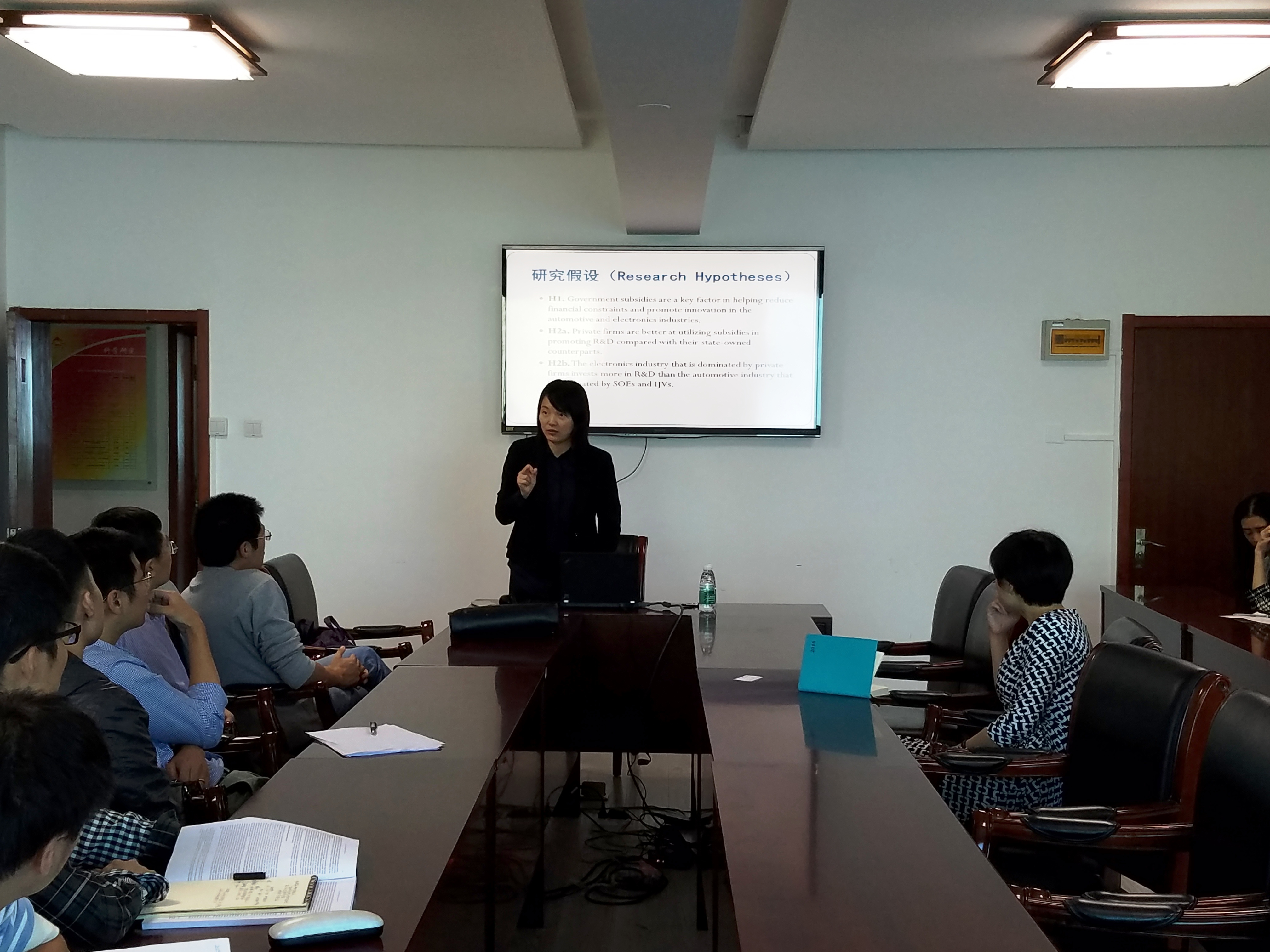 9月28日下午,诺丁汉大学商学院(中国)金融学副教授、国际金融研究中心副主任华秀萍博士应邀在博学楼925会议室举办了一场题为“产业政策与企业创新:来自中国汽车与电子产业的研究”的学术讲座。