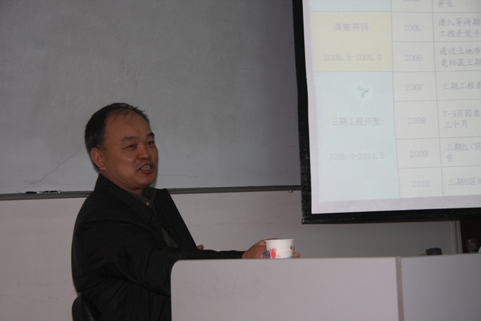 王晓岩先生毕业于中国人民银行研究生部,曾于中国人民银行总行资金司、中国科技财务公司等就职。 王先生的讲座从回顾北京房地产市场发展的过程展开,通过对 1990年至2010年北京市区内普通住宅参考均价和北京市区内普通住宅参考均价同比增长的数据分析指出,20年来,北京的房价从每平米的2000多元到30000多元,发生了巨大的变化。接下来, 王先生以自己公司开发的一个房地产项目比较直观地讲述了过去的十几年间国家政策以及市场的发展和变化。随后, 王先生分析了房地产发展对经济安全的影响。他指出现在的房地产市场确实存在一些泡沫,但是不会对经济安全产生太大的影响。 王先生还对当前房地产相关问题提出了自己的看法。一是部分城市房价上涨过快的原因,如北京、上海、杭州等地,主要在成本推进和需求拉动两个方面。二是保障性住房(经济适用房、限价房、廉租房)的开发政策。三是地方融资平台和税收政策对房地产市场的影响。最后, 王先生提出了自己对房地产市场健康发展的认识,政府应采用供需总量控制的方法来调节经济;减少行政命令和计划经济政策,顺应市场经济规律;大力发展中小城镇建设,提高居民收入,释放通胀压力,配合合理的制度。