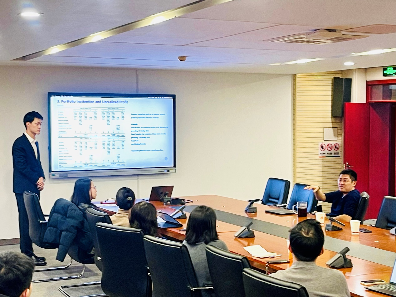 2024年12月10日下午15点,御宅屋 SBF论坛2024年第30次讲座在博学楼506举行。讲座特邀北京大学光华管理学院刘宇政博士进行学术报告,论文题目为“Portfolio Inattention, Unrealized Profit, and Threshold-Based Selling Strategies”。本次学术讲座由御宅屋 应用金融系张修平副教授主持,御宅屋 院长王天一、郭敏、潘慧峰、肖欣荣、王珏、边江泽、钟腾、祝小全等教师和众多研究生一同参与了交流活动。
