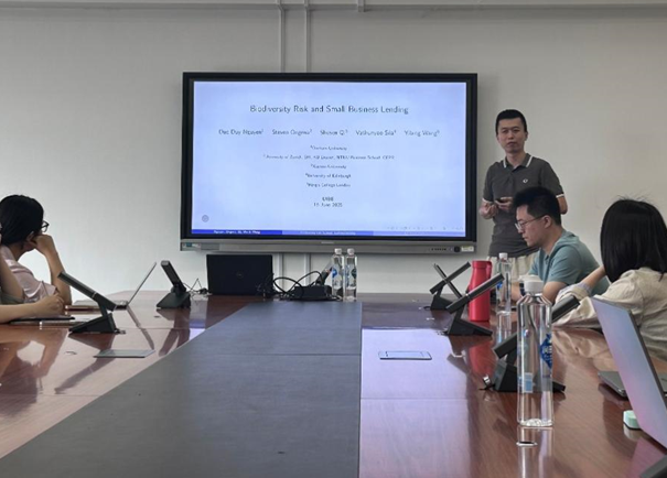 2025年6月16日上午10点,御宅屋 SBF论坛2025年第7次讲座在博学楼501举行。讲座特邀厦门大学管理学院财务学系副教授、博士生导师、北京大学数字金融研究中心研究员、International Review of Economics & Finance副主编戚树森进行学术报告,论文题目为“Biodiversity Risk and Small Business Lending”。本次学术讲座由御宅屋 旷纯老师主持,北京外国语大学国际商学院孙莎老师、御宅屋 宫迪老师和众多学生一同参与。