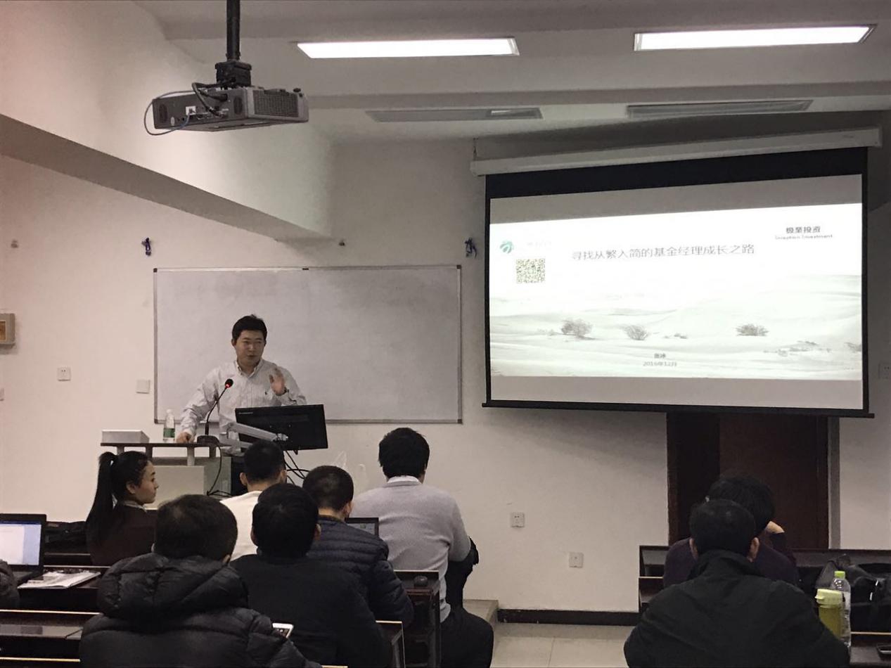 12月7日18:30-20:30,金融学院主办的业界系列讲座在博学楼918举办。此次讲座邀请了北京极至投资管理有限公司董事长张冰博士为同学们带来了主题为“寻找从繁入简的基金经理成长之路”的精彩讲座。本次讲座由量化投资专硕主任潘慧峰老师主持。