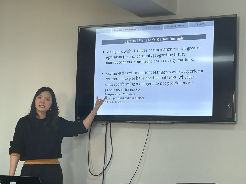 马琳琳副教授首先介绍了国内外共同基金的蓬勃发展,并重点强调了本研究所使用数据集的独特性。围绕基金经理主观期望与投资决策这一研究主题,马琳琳副教授及其合作者使用了2012-2022十年间中国共同基金在年报中对未来宏观经济和证券市场预期的文本数据,并使用传统词袋模型和ChatGPT对文本进行预期乐观程度的度量。由于该信息为中国证监会要求进行强制性披露的数据,与常用的问卷调查法相比较,显著降低了样本偏差。马琳琳副教授发现,总体预期的乐观程度与当前市场收益呈正相关,与未来一年的市场收益呈负相关。进一步分析发现,近期投资业绩对经理人预期的影响是非对称的,表现优异的经理人更倾向于表达乐观的预期,而表现不佳的经理人并不会表达悲观的预期。这种过去的业绩与预期乐观程度之间的真相关性在经验不足的经理人、此前年度持积极预期的经理人以及无女性成员的基金团队中尤为明显。此外,预期更乐观的经理人更倾向于采取较高风险策略,且随后表现不佳。最后,马琳琳副教授指出专业基金经理受强化学习偏差的影响所导致的扭曲信念可以对以上统计结果做出解释。