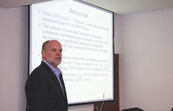 Pearson 教授的讲座从微观结构的角度为大宗商品市场的金融化提供了证据。他发现在美国,普通投资者经常会购买与大宗商品期货市场相关的票据,且他们的购买行为是与信息无关的。那么投资银行为了对冲发行这些票据的风险,会到大宗商品期货市场多头买入,而这一行为会给期货市场带来额外收益。由于这一收益并不是由投资者对期货市场未来走势的信息所导致,而是由金融对冲行为所导致,因此,为期货市场金融化提供了证据。