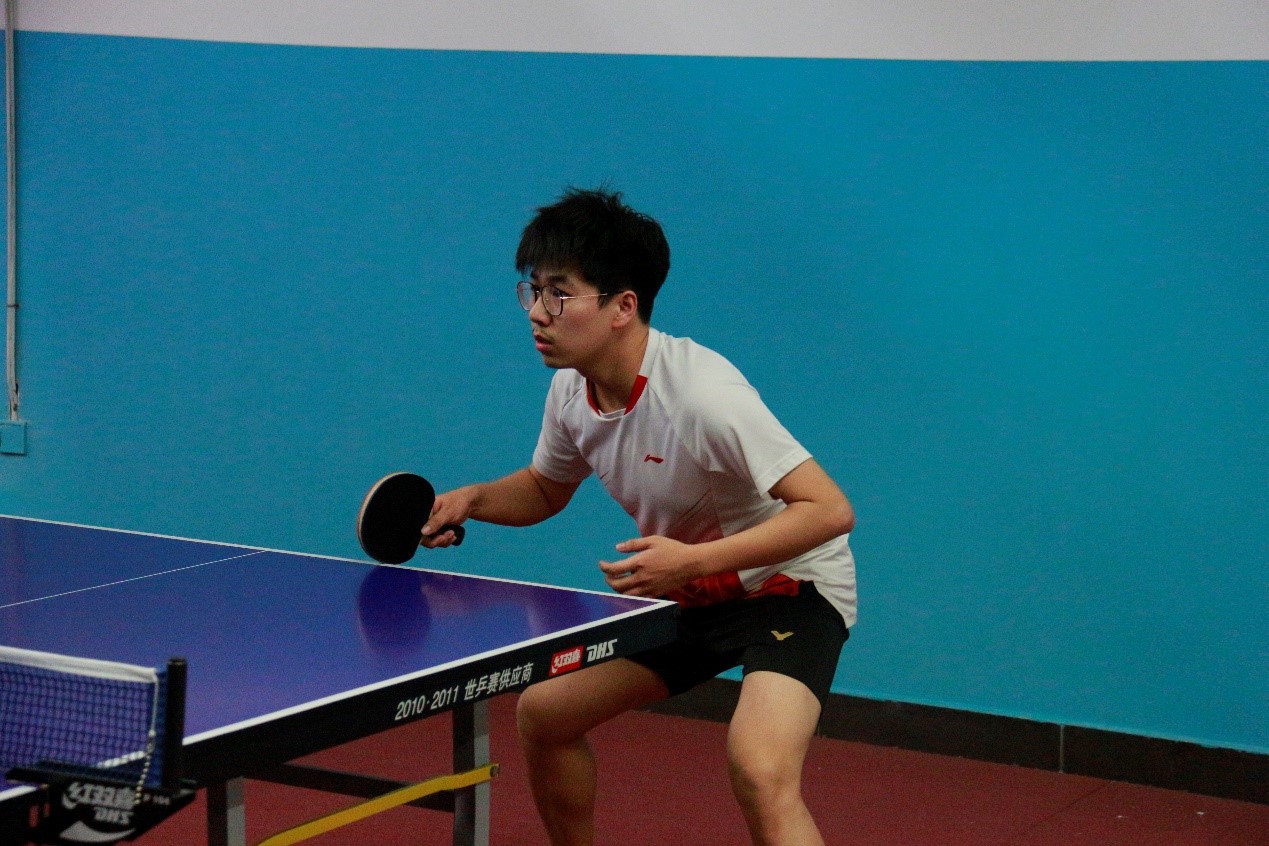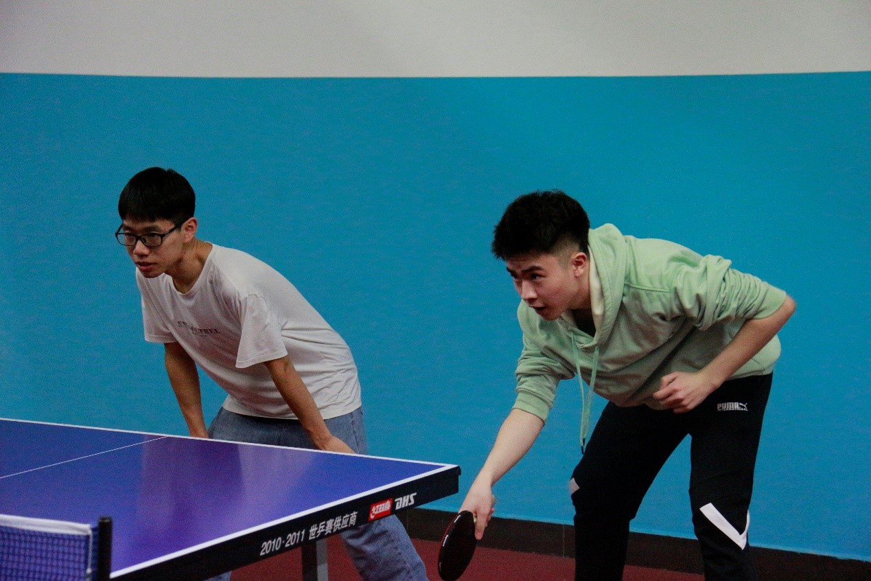 男双比赛激烈进行,我方两名队员李思放、李金桓敢打敢拼,第一场与国统的比赛便打出了多回合的神球,李金恒的反手打出大角度,直奔球台边角处,对方两位队员调动不及时,我方得分;李思放的弧圈球更是令人刮目相看,台下的队友和观众们连连叫好。他们配合默契,连胜三队。