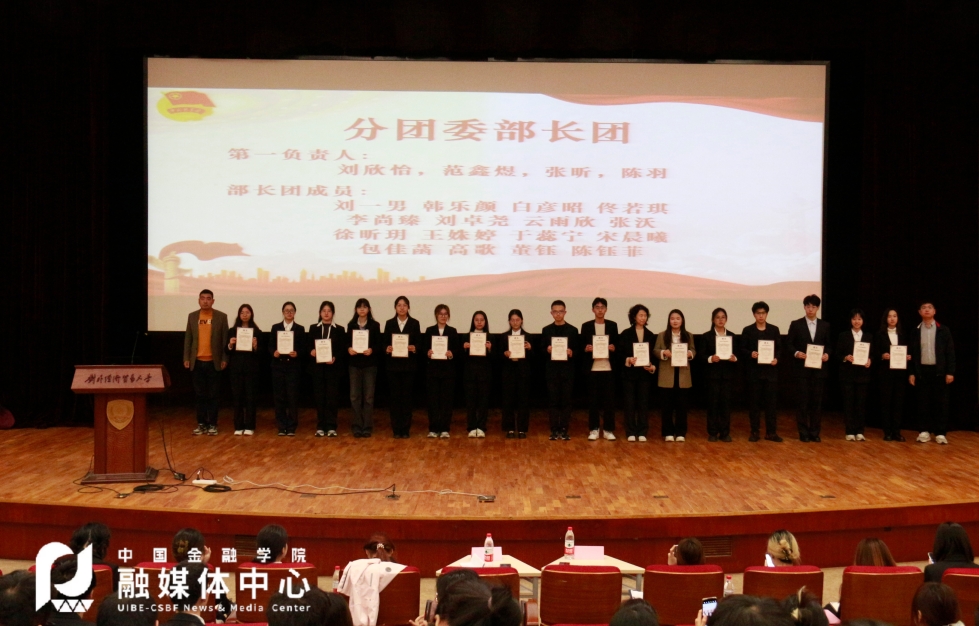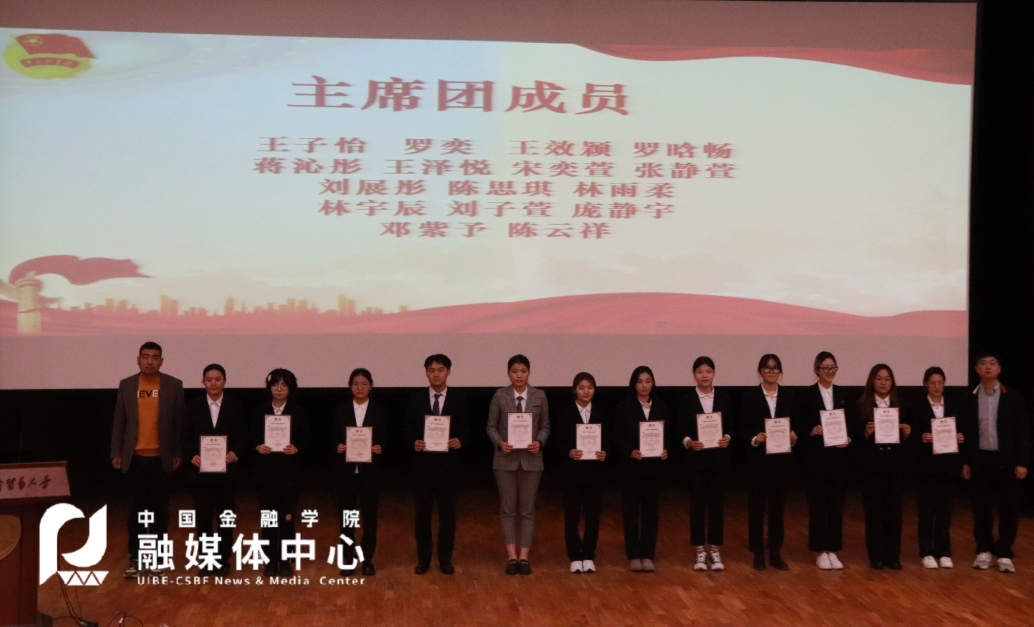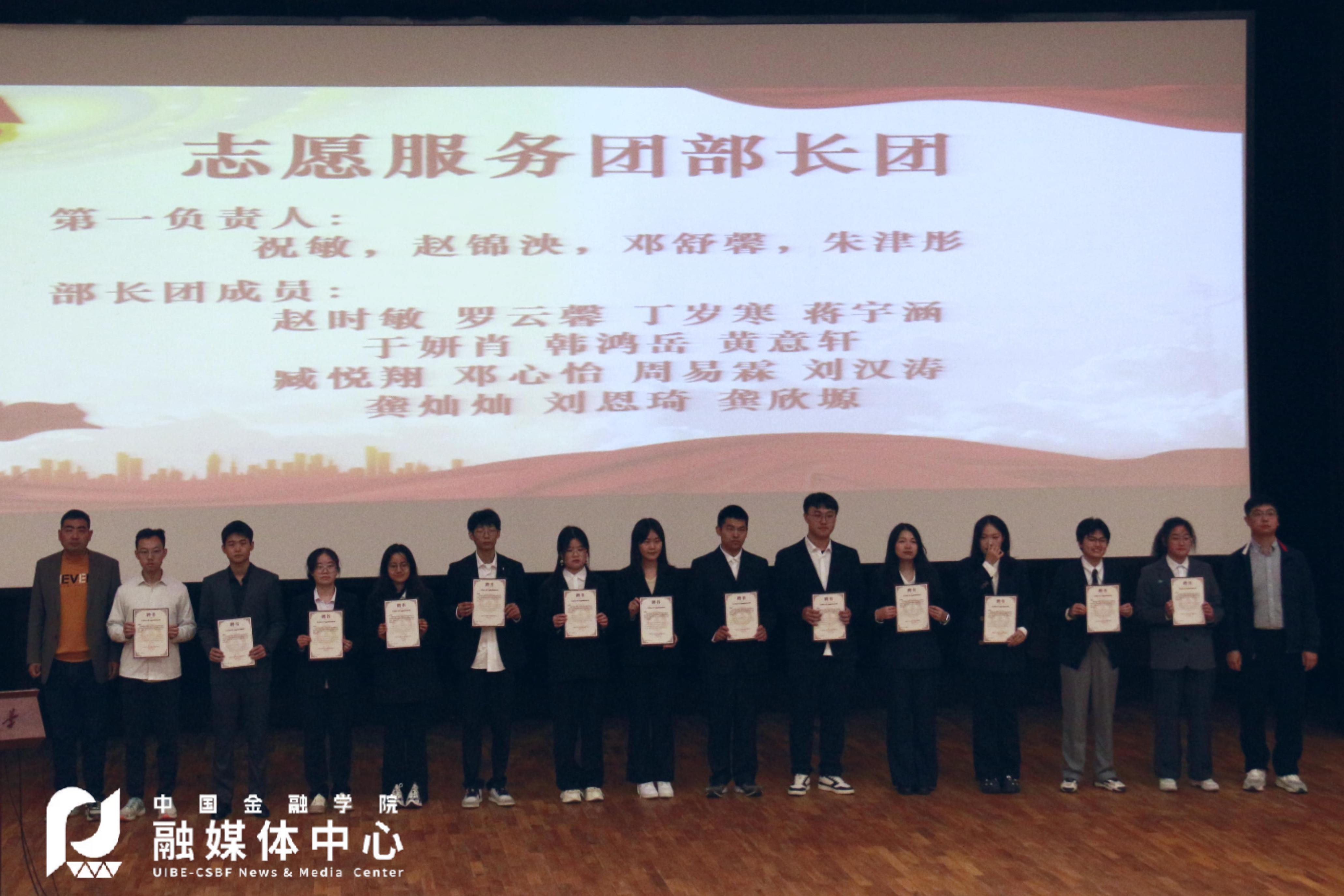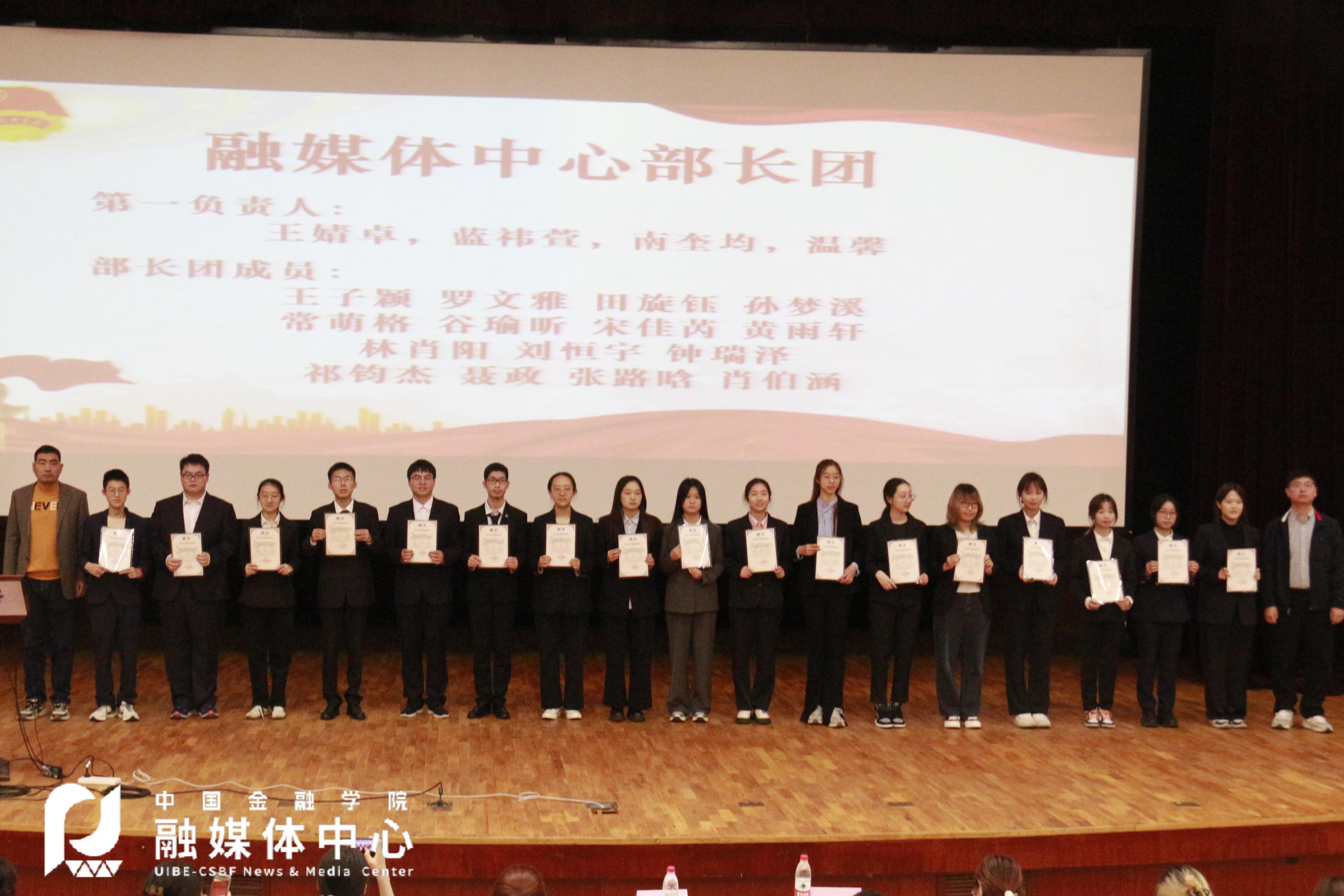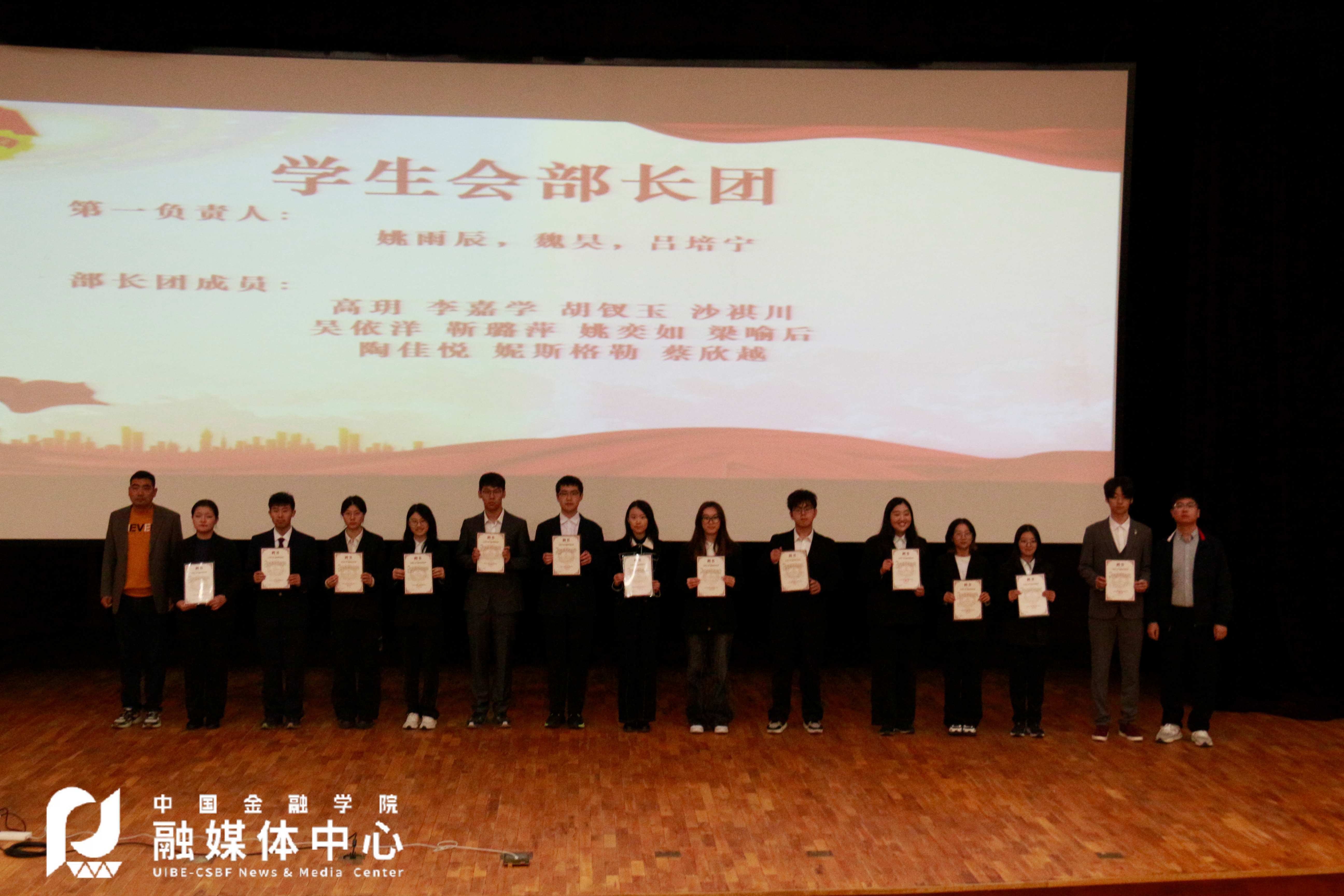 文之峰老师、穆晓志老师为新一届团学组织骨干成员颁发聘书。来自院党委融媒体中心、分团委、学生会、志愿服务团、学业指导中心、《金融方舟》编辑部、《足迹》编辑部、“金生”线上金融博物馆、“金心”朋辈心理互助中心的骨干成员依次上台受领聘书,并合影留念。