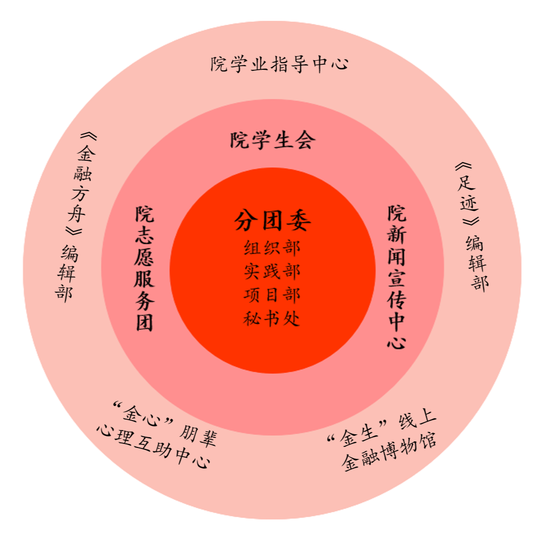 为响应团中央改革号召,金融学院分团委从基层工作实际出发,落实《深化学校共青团改革的若干措施》、《新时代学联学生会工作实施方案》等要求,继续推进团学组织改革,构建“一心双环”团学组织架构,即:在学院党委和校团委的领导下,以分团委组织部、实践部、项目部、秘书处四大职能部门为核心,以院学生会、院志愿服务团、院新闻宣传中心等学生会组织为学生自我服务、自我管理、自我教育、自我监督的主要学生组织,以院学业指导中心、《足迹》编辑部、《金融方舟》编辑部、“金生”线上金融博物馆、“金心”朋辈心理互助中心等学生社团类学生组织为外围延伸手臂,构建“一心双环”的团学组织基本格局。