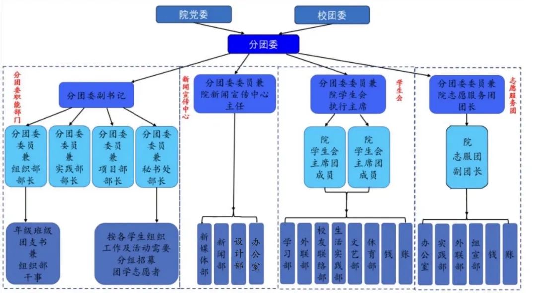 分团委委员受分团委书记委派到各学生组织,担任各学生组织第一负责人,或协助所在学生组织负责人管理各部门工作。
