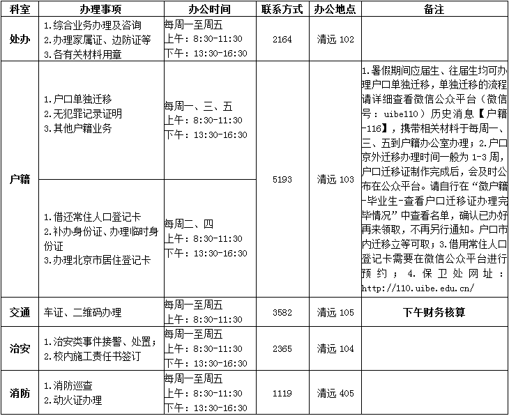 暑假期间保卫处相关科室办公时间及校门开放时段一览表