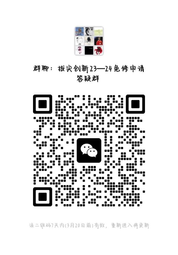 需要提交免修申请或对其有任何疑问的同学请扫下方二维码进入“拔尖创新 23-24免修申请答疑群”(若群人数超过200人可添加右图负责同学邀请进群)