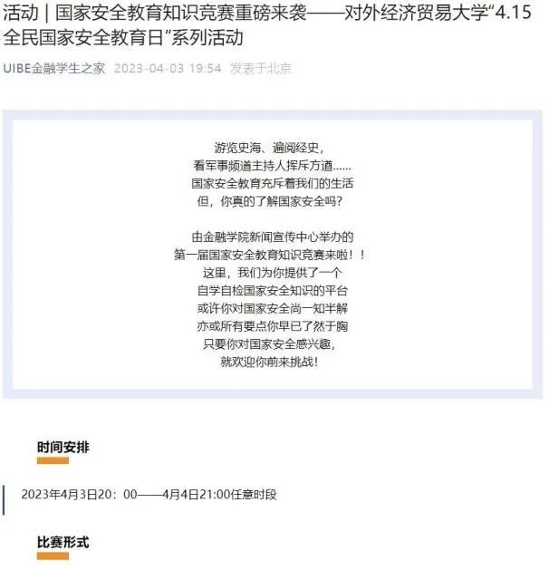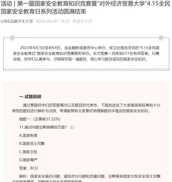 作为金融学院4.15全民国家安全教育日系列活动的重要内容之一,4月3日至4月4日,金融御宅屋新闻 宣传中心组织承办了“金融学院国家安全教育知识竞赛”活动。活动通过线上问卷星答题的方式,随机选择70道不定项选择的题目,覆盖了国家安全教育、《国家安全法》内容、相关国家机关职能、组织与个人义务、各类安全事件等多个角度。