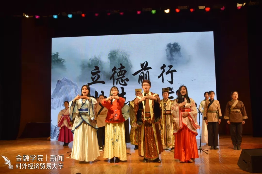 金融学院在整场比赛中第五个登场,参赛者们表演到位、感情丰富。周鹏凯、王宜轩饰演士大夫,二人角色一忠一奸,人物形象生动、配合默契。在任若琳、冯芊宁、张语熙、韩庆媛所饰军士的《兵车行》吟诵中,观众们深深体会到了立德对于国家民族的重要性。黄津、何欣妍、李甜、者斯琪、高雅、周渊海六人合力演绎出了“以德安家,入孝出悌动天地”的和美家庭景象,黄津在台上泼墨挥毫、写下“立德颂”三字,引来现场观众的阵阵掌声。吴凌薇、闫歆玙的琵琶、古筝伴奏也为节目增色不少。最后一幕全体表演者一齐发声“天地玄黄,宇宙洪荒,须铭记,立德前行,壮志不忘”,更是气势磅礴、令人动容。