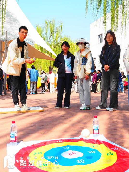 “抛砖引玉”处,在欢快的氛围中,参与者通过投掷沙包赢取积分兑换印章。这一环节不仅考验手眼协调能力,更以轻松的方式拉近了同学们与红色金融文化的距离,欢声笑语回荡在广场;