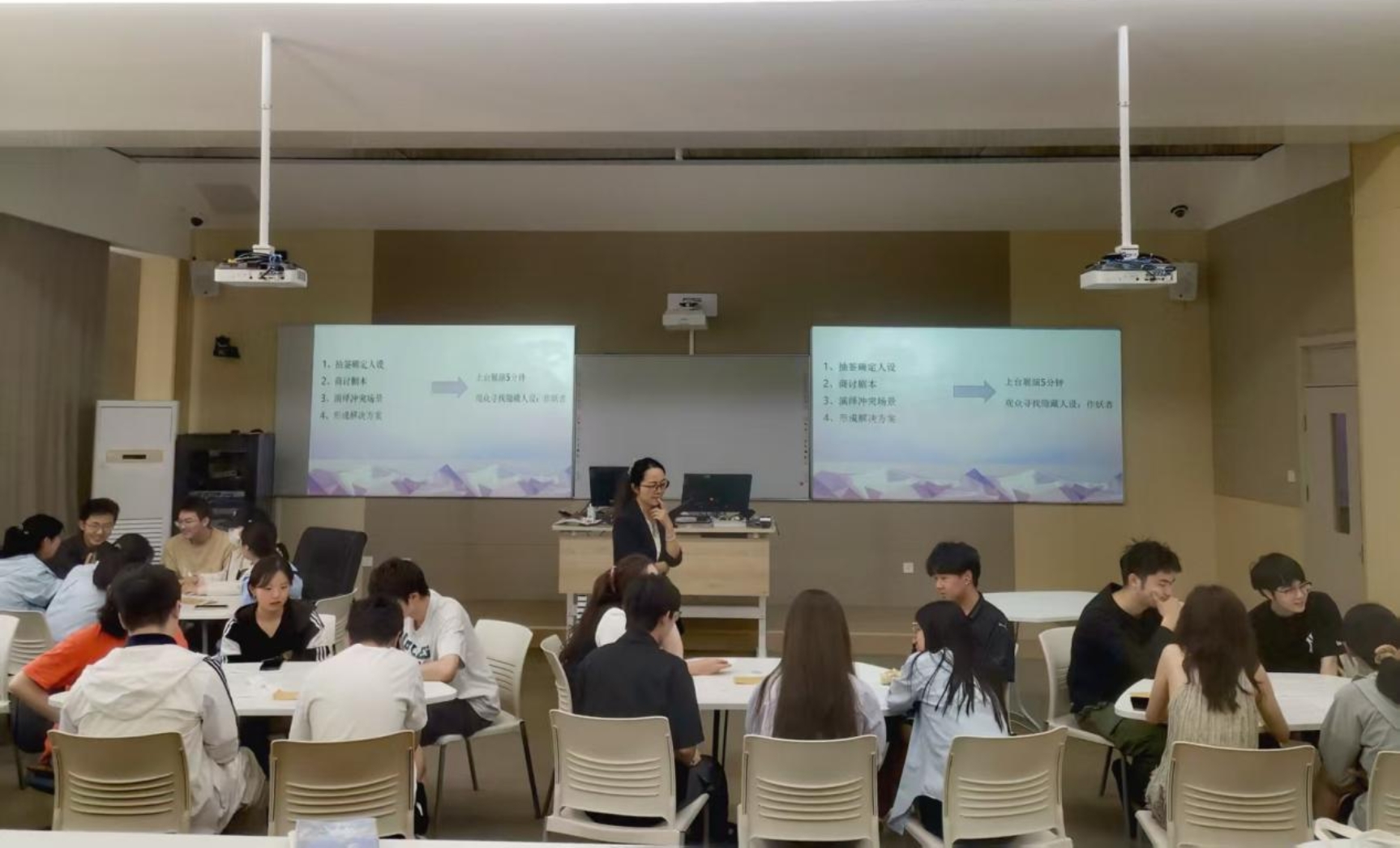 活动高潮是“剧本杀”实战环节。宿舍长们抽签确定“早八烈士”“戏精本精”“噪音污染源”“玄学养生家”等特色人设,围绕预设冲突场景演绎并讨论解决方案,深化对沟通技巧的理解,聚焦如何化解宿舍矛盾。