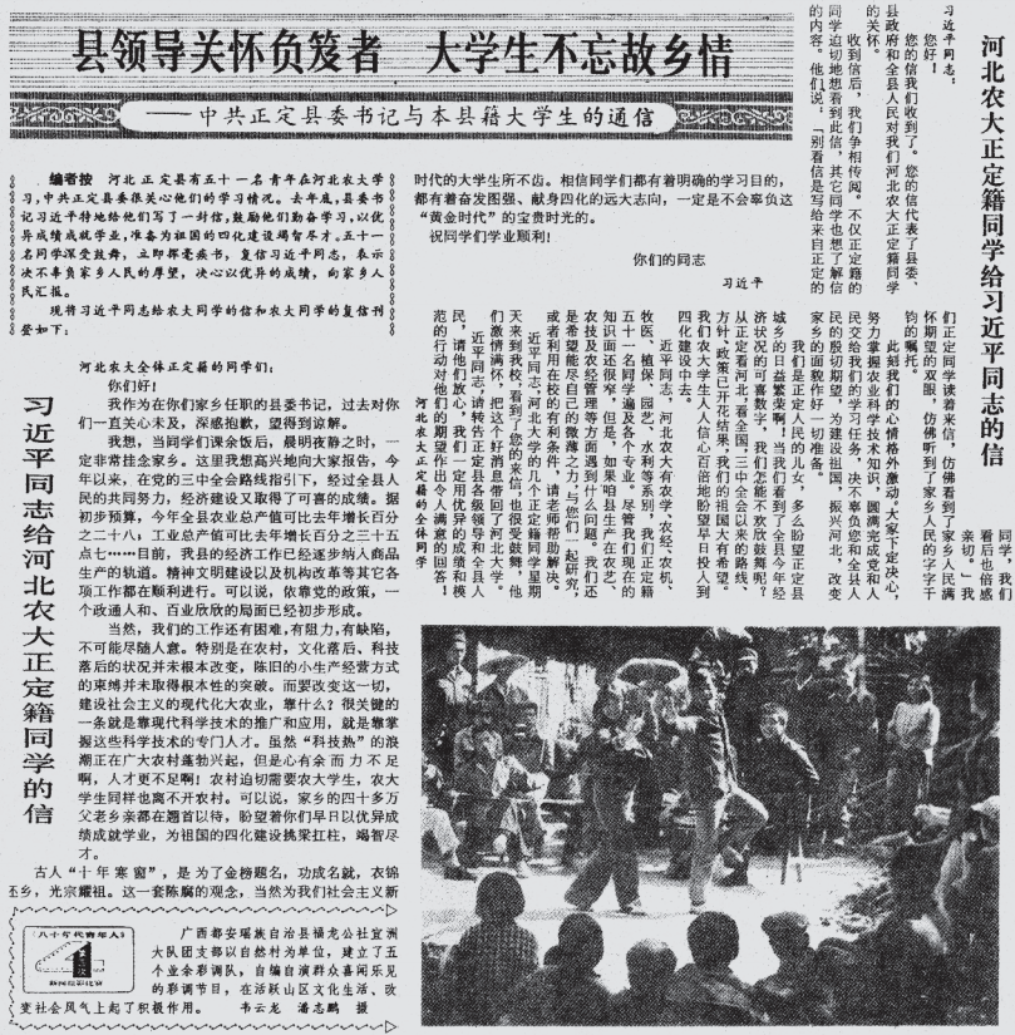 1984年3月13日,《中国青年报》以《县领导关怀负笈者 大学生不忘故乡情——中共正定县委书记与本县籍大学生的通信》为题,报道了习书记与河北农业大学全体正定籍学生之间的书信往来,并全文刊登了这两封信。