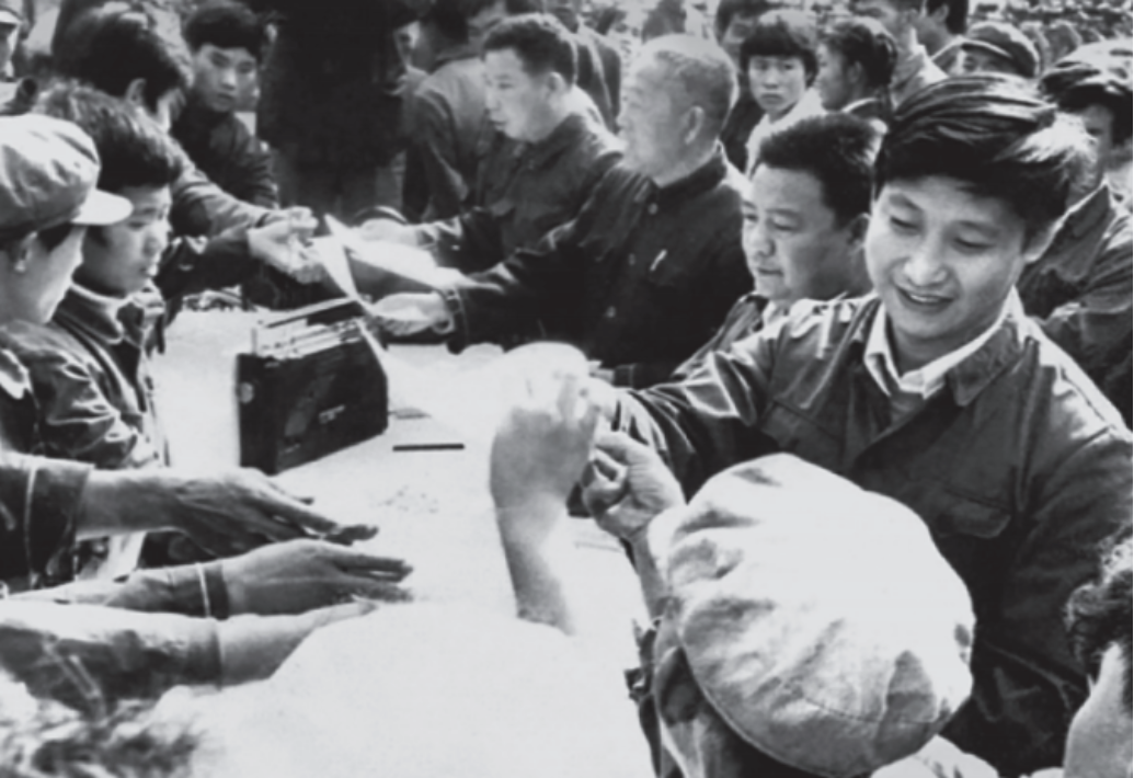 ※习近平带领县委工作人员在正定县街头发放民意调查表。