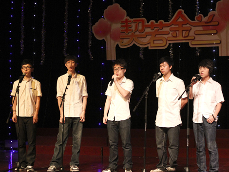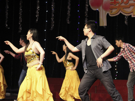 晚会节目正式登场,首先上演的是由金融三班王文超等五名学生带来的小品《二大爷的爱》。其对白风趣幽默,犀利地揭露了当今社会的拜金主义,表演惟妙惟肖,引场下阵阵欢笑。随后是07级学生党支部诗朗诵《四年·思念》,以温情的诗词打开记忆的阀门,“用一时去回忆,用一生去感恩。”告白悲伤,由三组演唱者带来的歌曲串烧《因为爱情》、《天黑黑》、《在我生命中的每一天》尽显金融学子美妙的歌喉,在浓情的词句中蕴含对母校的深深眷恋。在一组异域风情舞蹈串烧中,男女共同登台大秀肚皮舞,风格别致,在曼妙的舞姿中展现了金融学子幽默一面。