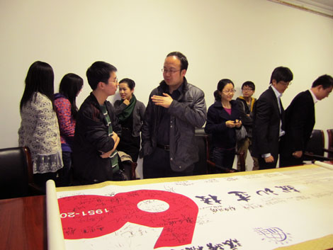 紧接着进入提问环节,5位校友分别就同学们提出的关于“海外学习背景对找工作有多大帮助”“专业是否对口对寻职的影响大小”“考公务员之路是否可行”等问题一一做了解答。活动尾声,主办方还向5位校友赠送了金融学院精心准备的精美纪念品,并请他们在校庆60周年校友签名卷轴上签名留念。活动在轻松融洽的氛围中结束。