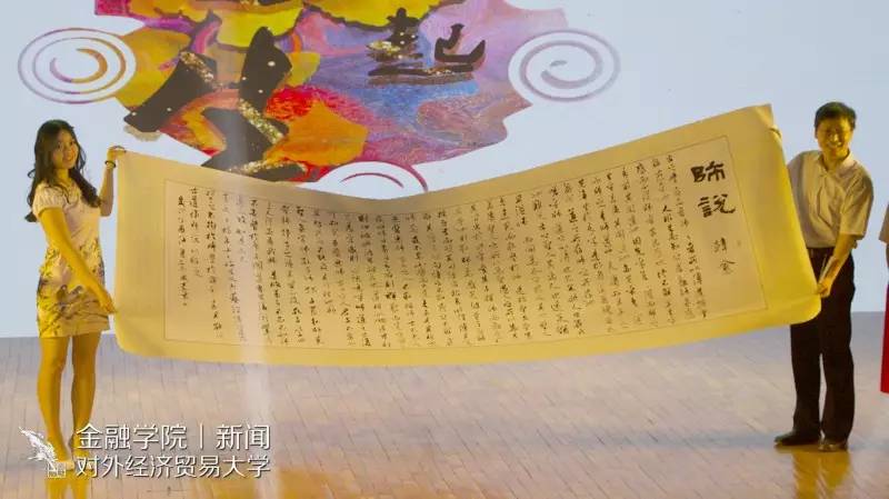 最令人瞩目的还属教师模特大赛,平日略显严肃的老师们都纷纷展现了自己活泼可爱的一面,腼腆而兴奋的脸上闪耀着青春的活力与光彩。节目表演完之后,2013级全体学生在值金融学院三十周年之际向吴卫星院长送上了一份特别的礼物---书法作品《师说》,希望能借此表达他们对金院老师四年来悉心教导、倾心培养的感谢之情。