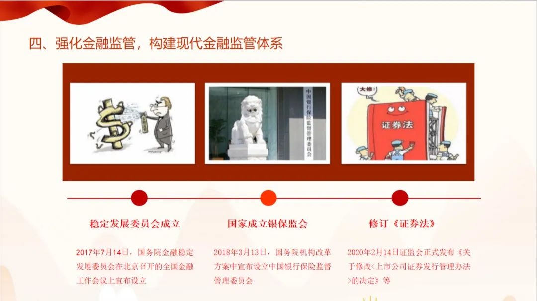 王慧霞同学为大家讲解了习近平中国特色社会主义新时代的金融历史。党的十八大后,我国进入了经济发展新常态。习近平总书记高度重视金融,引导金融回归服务实体经济。在这种思想的指导下,金融市场化改革不断深入,金融监管体系不断完善,金融反腐力度不断加大,金融开发大门越开越大。科创板上市、货币政策工具革新、银保监会成立、《证券法》修订,人民币加入SDR等一系列金融大事记见证着新时代的巨大成就。