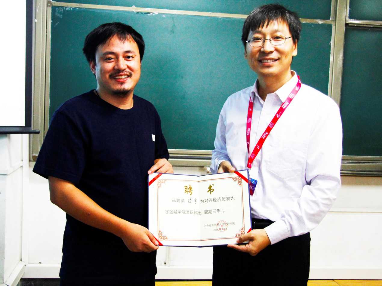 讲座开始前,吴卫星院长向陈宇校友颁发金融学院兼职教授聘书,对陈宇校友表示热烈欢迎和衷心感谢。