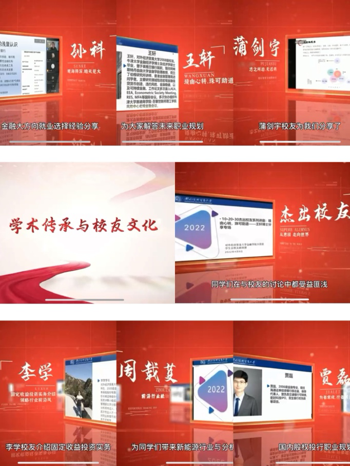 “薪火相传、继往开来”。金融文化节邀请毕业多年的校友,开展校友论坛,凝聚校友力量。王轩博士结合自身经历,为同学们解答未来职业规划及面对世界变化如何调整心态;周载芟学姐为同学们带来新能源行业与分析师的工作分享;贾磊学长与同学们探讨国内股权投行职业规划,分享自己的独到见解;孙科学长带来金融大方向就业选择经验分享,为同学们答疑解惑;李学校友介绍固定收益投资实务,讲述不一样的观察视角;蒲剑宇校友分享投行资管方向职业规划,同学们在与校友的交流讨论中受益匪浅。