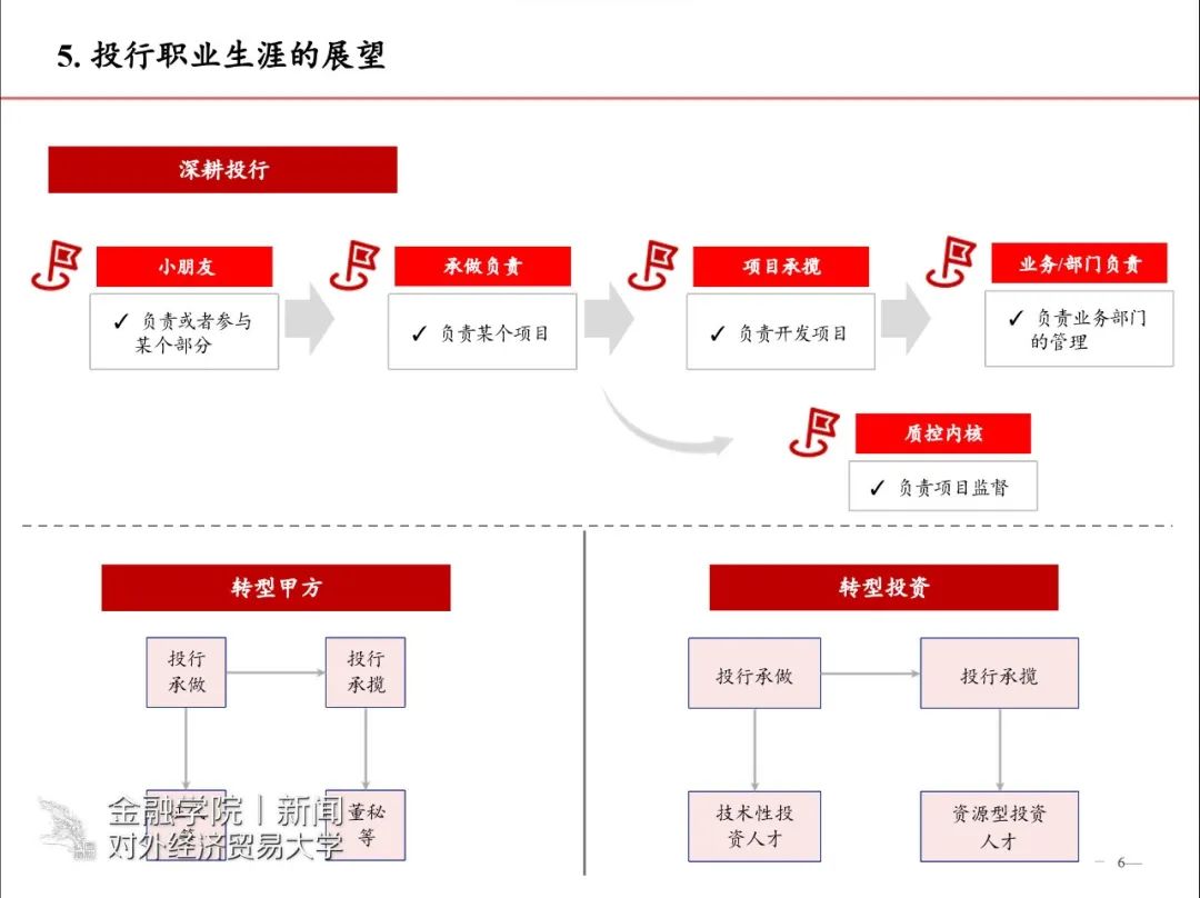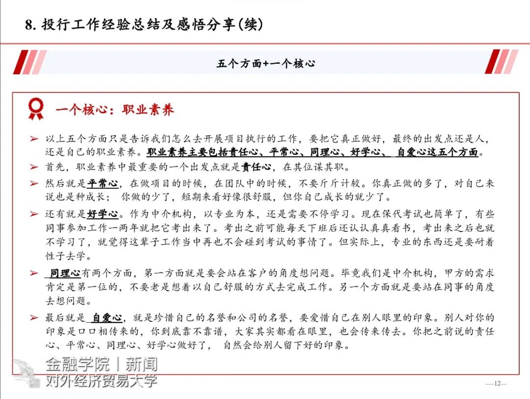随后,梁文学长从投行领域相关的业务、工作日常、投行职业岗位说明和要求以及自己的成功经验等八个部分展开演讲。