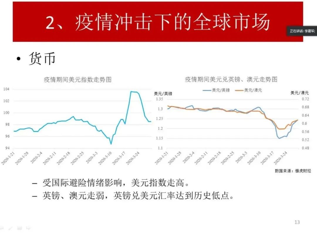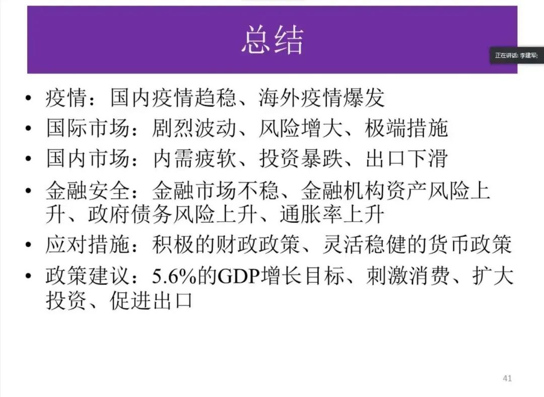 讲座伊始,李建军教授描述了国内外新冠疫情的发展状况,并从汇率、消费情况和失业率等多角度对在新冠疫情冲击下的中国市场和全球市场进行了简要的介绍。李建军教授同时充分肯定了我国在世界抗疫防控中做出的牺牲和贡献。