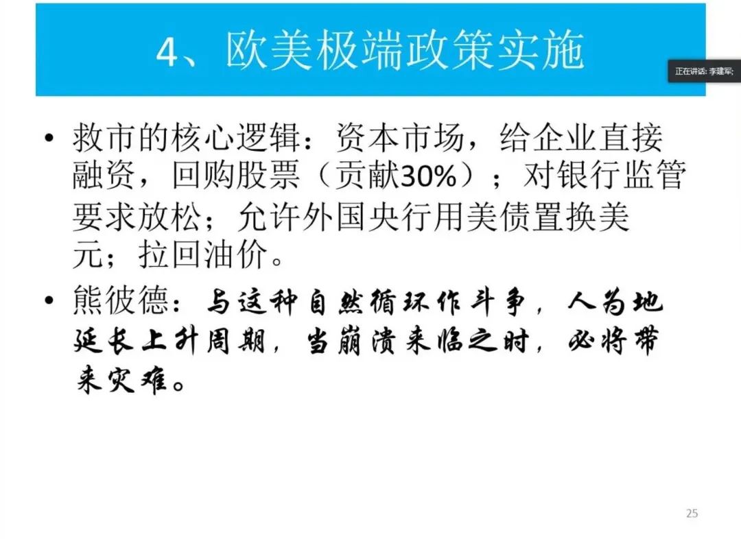 随后,李建军教授对部分欧美国家所采取的极端政策进行了具体分析。他首先指出其政策“救市”的核心逻辑是放松对银行的监管、允许外国央行用美债换美元,但这无法从根本上解决问题。李建军教授还重点阐述了这些极端政策的弊端:政府债务负担增重、无法长久维持人民生活质量、中小企业资金流阻断、失业率上升等。