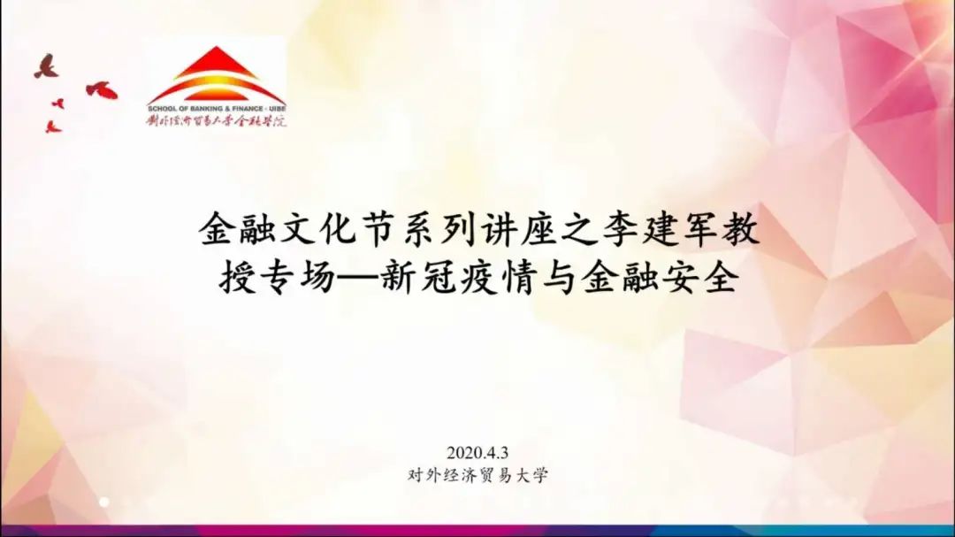 金融御宅屋新闻 宣传中心讯(记者:胡紫涵)2020年4月3日18:30,“金力抗疫,融汇英才”第十九届金融文化节首场讲座之李建军教授专场——新冠疫情与金融安全主题讲座以线上直播的形式成功举办。中央财经大学金融学院院长、中央财经大学国家金融安全教育部工程中心主任李建军教授针对新冠疫情影响下的金融安全问题进行了一次精彩的演讲。本次讲座作为第十九届金融文化节首场讲座,吸引了校内外师生近200人参与。