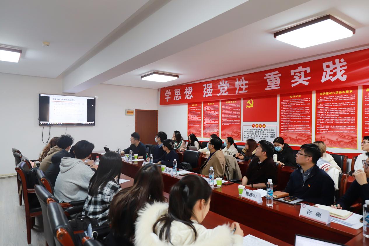 陈玉平老师简要介绍中央金融会议精神和本次会议的学习主题,指出“要在金融系统大力弘扬中华优秀传统文化,坚持诚实守信、以义取利、稳健审慎、守正创新、依法合规”,这明晰了金融院校的人才培养目标,指明了党建工作和思政教育的努力方向。