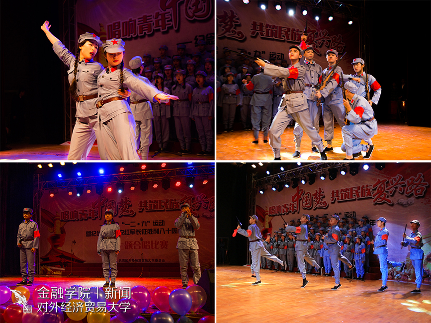 由金融学院和法学院共同组成的合唱团为学生们带来了歌曲《在太行山上》、《游击队歌》。合唱团真可谓是花样百出,将一首具有年代感的红歌唱的有滋有味,有模有样。他们身着军装,歌声时而铿锵有力,时而轻松欢快,其中不仅穿插了优美的伴舞,还穿插了一段京剧《林海雪原》。与其他学院参赛队伍不同的是,两院合唱团将两首风格不尽相同的歌曲混合到了一起唱,但却浑然天成。合唱团精彩绝伦的表演赢得了观众的阵阵喝彩。