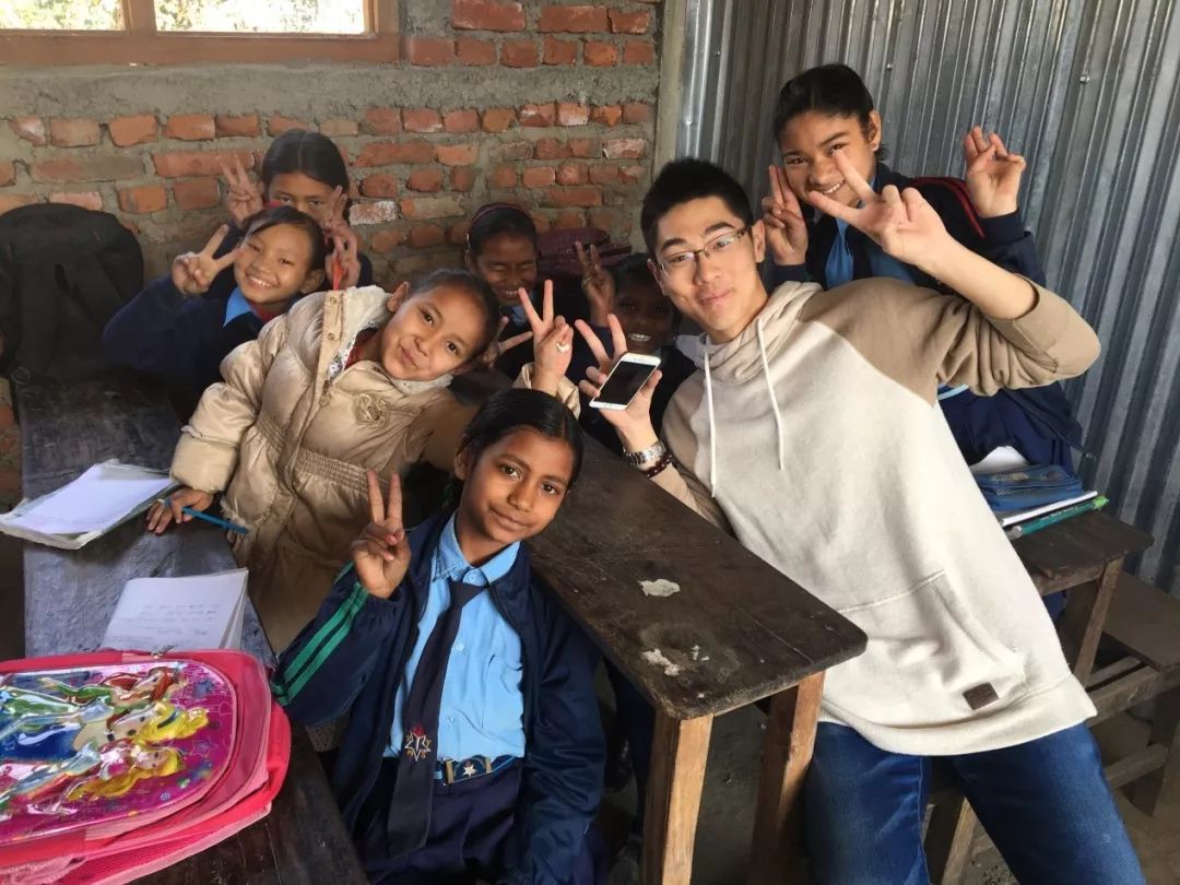 (孙一甘在尼泊尔和孩子们在一起的照片)