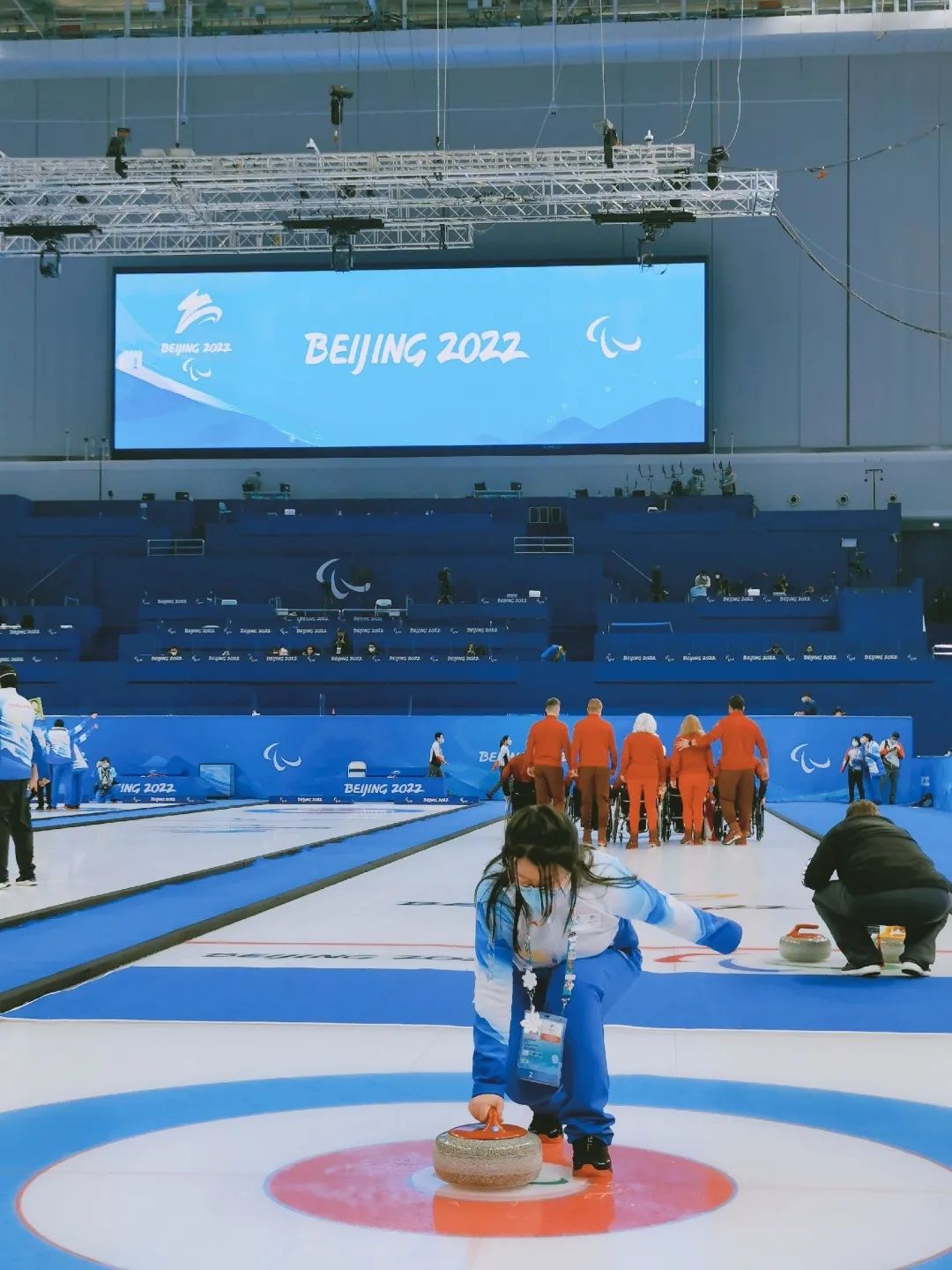 A: 实话实说,我在来到冰立方之前对冰壶运动没有太深入的了解,只是通过学校组织的旱地冰壶比赛以及得知服务此项目之后的视频资料。进入冰立方的第一天,看到在冰面上放好的一个个冰壶和四条赛道,我就产生了对冰壶的兴趣。在这段时间我们因为工作原因学习冰壶知识、因为兴趣主动探索、在冰壶比赛的环境里耳濡目染,逐渐发现这是一项很有意思很有魅力的运动,是体力与脑力的结合,非常刺激。现在我对于冰壶的比赛流程、规则、传统、基本战术以及冰壶运动员都有了一定的了解,在冬奥会冬残奥会结束之后也主动持续关注冰壶,以后有机会也希望能够再次到现场观看冰壶比赛,可以说是完全是因为这次冬奥会的志愿经历让我从零开始真正爱上冰壶这项运动。