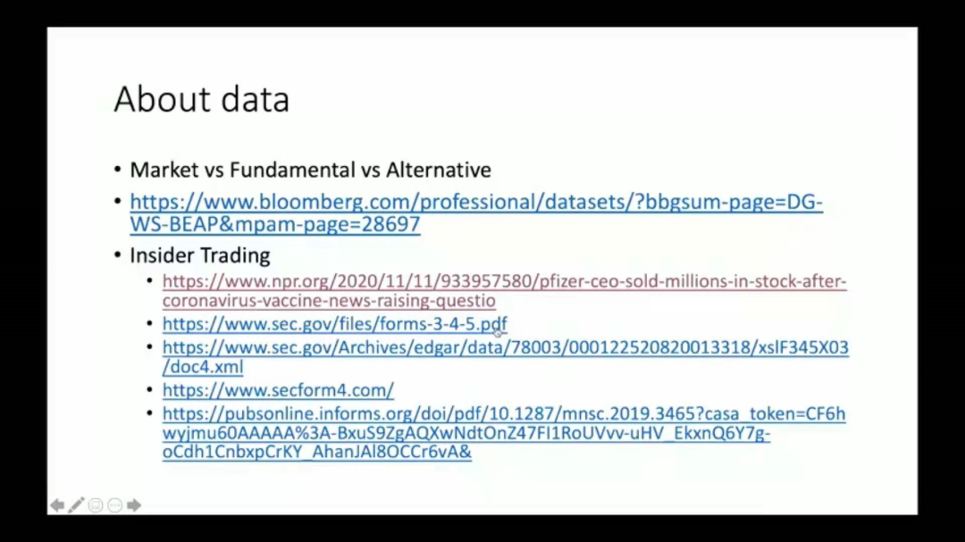 对于交易数据,学长简要介绍了三种数据(market,fundamental,alternative),并阐述了量化金融行业的交易信息搜集要求。