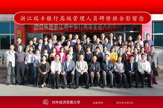 2012年9月9日至10月15日,御宅屋 为浙江义乌农村商业银行和浙江瑞丰银行进行共三期的高级管理人员培训并取得了圆满成功。本次培训得到了校院领导的高度重视,御宅屋 副校长刘亚教授、金融学院院长丁志杰教授分别出席开学及结业典礼并致辞,本次培训的内容设计、课程安排、师资配备及培训效果得到了义乌农商行和瑞丰银行行领导及参训学员的一致好评和高度赞扬。很多学员认为课程时间太短,学的还不够。