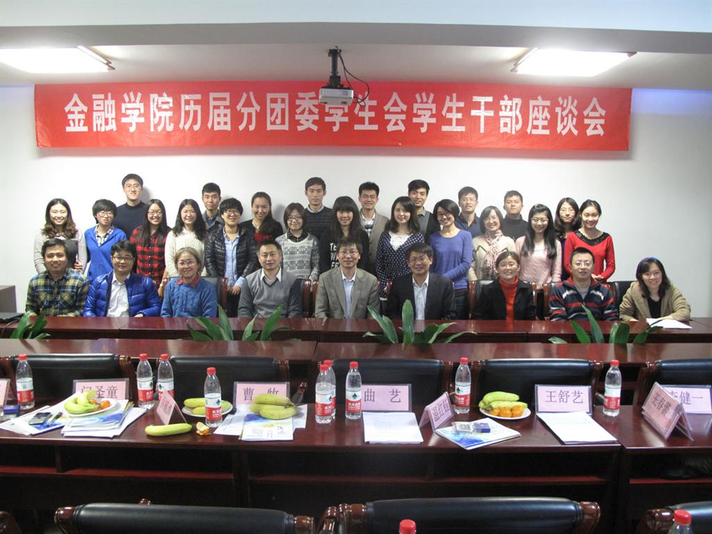 2012 年12月15日15:00,金融学院历届分团委学生骨干重返金融学院,在博学楼925参加金融团学干部座谈会。金融学院院长丁志杰、分党委书记吴卫星、分党委副书记王春蕾、分团委书记王祖瑞、原团总支书记庄红岩、校友工作办公室主任刘莹、校友工作负责人白艳、辅导员兼校友工作办公室负责人刘莹出席会议,并与学生干部亲切交流。
