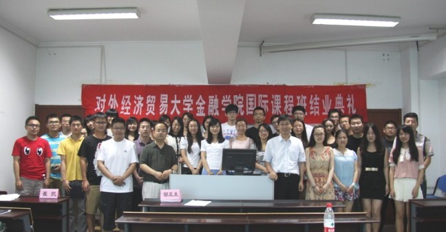 金融学院2013届国际课程班结业典礼于2013年6月20日隆重举行,金融学院吴卫星书记、邹亚生副院长、潘慧峰副院长、张海洋老师、办公室主任崔凯老师出席了典礼,汤婕老师主持了此次结业典礼。