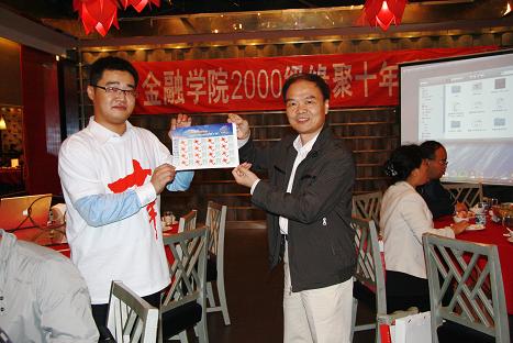晚上七点整,在金融学院丁志杰院长的宣布下,活动正式开始。主持人首先介绍了出席活动的来宾,并举行赠送纪念品仪式。2000级代表向校友总会叶文楼秘书长和丁志杰院长赠送了为本次活动专门制作的邮票。同学们更为学院精心准备了一份特别的礼物,将28名同学的拇指印印在金融学院院徽周围,寓意:金院发展,鼎立支持。