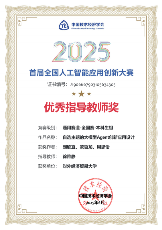 此次大赛由中国技术经济学会主办,旨在推动人工智能技术的创新与应用,吸引了来自全国各地的优秀团队参与。本次获奖团队成员刘欣宜、欧哲龙和周思怡均为御宅屋 2024级“金融科技+人工智能”联合学士学位项目本科生,指导教师徐雅静教授为项目授课教师,来自北京邮电大学。该项目是御宅屋 与北京邮电大学人工智能学院联合开展的跨学科、复合型人才培养项目,自2024年启动以来,通过两校优质资源共享、学科深度交叉融合的创新培养模式,为学生提供了扎实的金融科技理论基础和人工智能实践应用场景。此次三位同学获奖体现了该项目促进多学科交叉融合,协同解决实际问题的巨大潜力。