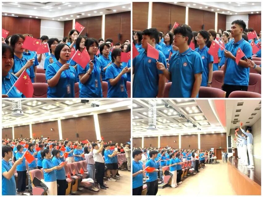 宣讲结束后,现场全体新生起立,手持国旗,齐声高唱《歌唱祖国》。激昂的旋律响彻报告厅,旗帜舞动如海,歌声汇聚成情感的洪流,展现了新时代青年对祖国的深切热爱与坚定信仰。这一刻,历史与当下交汇,青春与使命共鸣,为整个教育活动注入了强烈的情感力量和集体凝聚力。