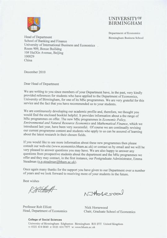 2011新年伊始,御宅屋 收到了英国伯明翰大学经济系发来的感谢信。信中,伯明翰大学对御宅屋 与之合办的1+1硕士留学项目给予了高度的评价,并对御宅屋 长期以来对本项目在学生选拔与推荐、预科学习与考核等工作的大力支持表示感谢。