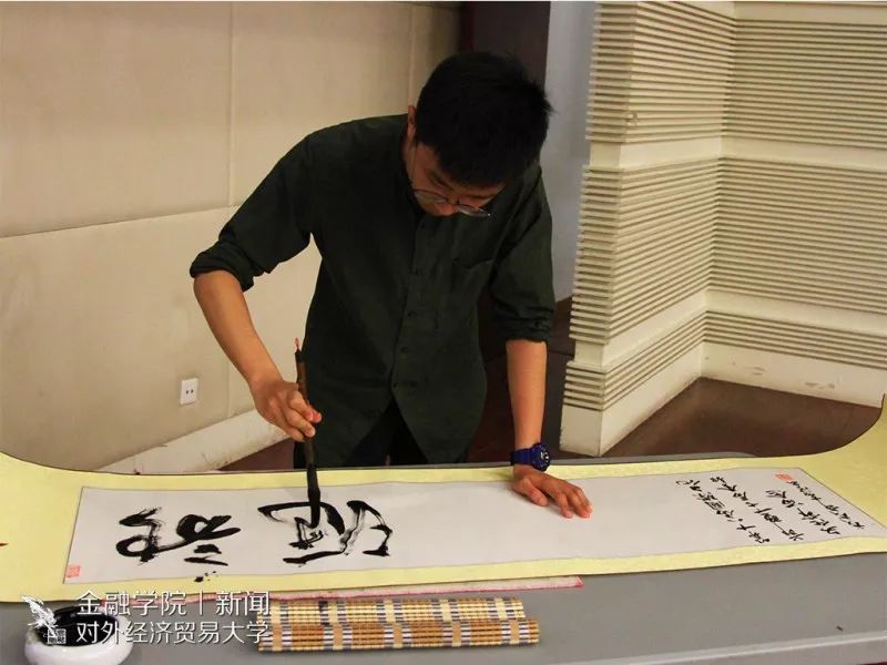 最后的“青春与文化的融合”环节中,金融学院2017级本科生、校书画协会成员黄津现场展示书法《融》并赠送给了Michael R. Powers及其夫人。书法作品上“融汇远航”四个字,体现了国际文化的相互交融以及金融文化的蓬勃发展,同时也包含着贸大人引以为傲的的远航精神。