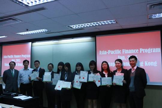 2015年寒假,由金融学院、经贸学院等38名本硕同学参与的“新加坡-香港亚太金融研习项目”成功举行。在海外的14天当中,同学们聆听了来自新加坡国立大学、新加坡管理大学、香港大学、香港中文大学等一流教授课程,并通过中银国际投行部、安信证券投资部、英国保诚集团财富管理部门的金融案例实战,度过了一个充实而丰富的寒假。