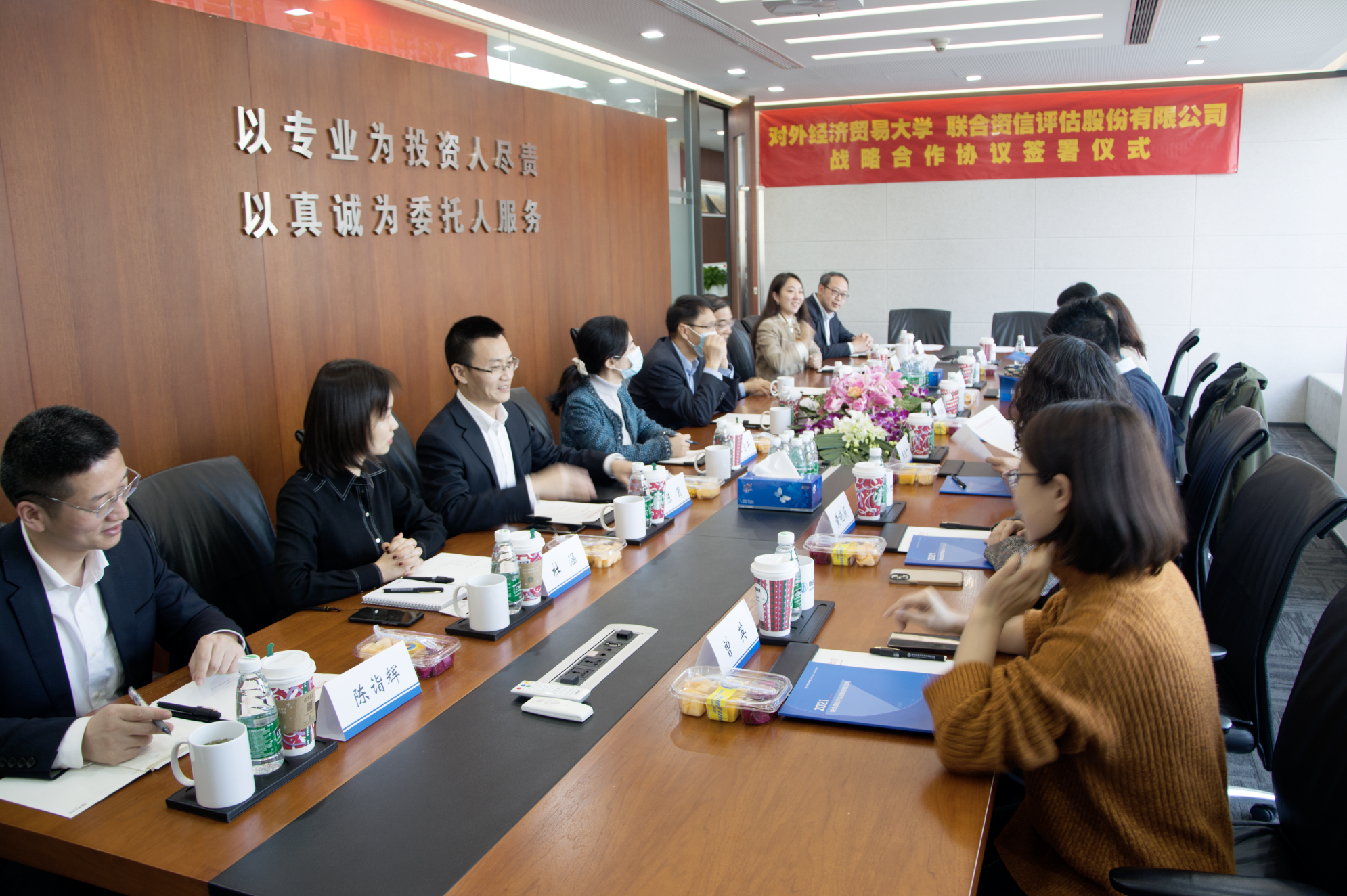 仪式开始前,双方进行了友好交流和会谈,邹亚生院长代表御宅屋 致辞,他表示,特别高兴此次与联合资信达成战略合作协议,亦感谢联合资信对金融学院人才培养的大力支持。此前双方已经过多轮交流和磋商,就人才培养和科研支持等多个方面形成了共识,联合资信本学期为御宅屋 金融学院硕士研究生开设的课程也已获得良好的教学效果,为双方的合作打下了坚实的基础。在战略合作框架协议下,相信双方未来一定能继续拓展合作的广度和深度,实现共赢。