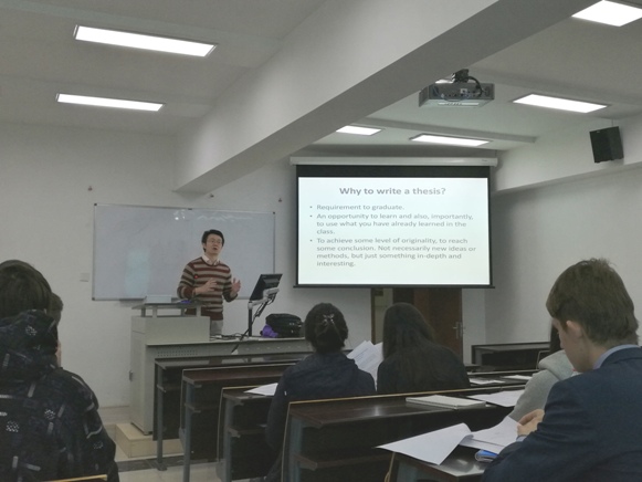 10 月 21 日,金融学院 2017 届英文本科留学生毕业论文指导会顺利举行。金融学院卞洋老师作为主讲人出席了此次论文指导会,就 2017 届毕业生所面临的毕业论文选题、撰写以及数据查找、资料整理等方面做了详细地说明。 首先,卞老师解释了为什么要写一篇论文。他说这不仅是能够毕业的必要条件,更是一次学习与进步的机会:在攥写论文的同时,把在课堂中学到的知识运用到实践中,绝对会发现更加新颖和有趣的知识。 接着,卞老师详细地说明了撰写毕业论文的步骤。从选择一个感兴趣的话题开始、联系指导教师、撰写开题报告、进行实证研究、起草毕业论文直到最后的定稿,每一步都很重要。卞老师尤其强调了引用文献时一定要注明出处来源,不可抄袭他人的作品,更不是简单的复制粘贴,希望学生予以重视。 紧接着,卞老师描述了论文写作的框架与构思。他将论文分为六个部分:引言要展现出所研究的问题和中心思想;文献综述是对攥写论文前所阅读的相关论文的总结;数据查找和研究方法的选择是实证研究最重要的环节;研究结果最好简洁明了,可用图表形式标明;汇总论文主要观点以及全面总结整篇论文。形成论文的每个环节都是必不可少的,希望学生在每个环节都能做好,这样才能展现出一篇高质量的论文。 最后,卞老师告诉同学们:在写毕业论文期间一定会遇到各式各样的问题与挑战,在以后的人生道路上也会遇到很多困难,他希望同学们积极地去面对这些挑战,尽力做好现在自己能够做到的事情。 会后,英文本科留学生班主任汤婕老师对论文的写作、提交、评阅等程序进行了补充说明。对同学们所关心的实习学分的认定与审核、毕业论文的评阅与评定、毕业资格的审核与通过、本科学位的申请与授予等问题进行了详细的解答和说明。 本届英文本科留学生是御宅屋 的首届全英文授课的本科留学生,共 20 名学生,来自印度尼西亚、澳大利亚、瑞典、西班牙、泰国等 13 个国家。愿金融学院 2017 届英文本科留学生能够如期完成毕业论文,顺利毕业。