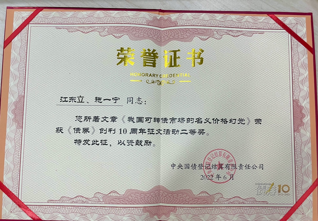 近日,由中央国债登记结算有限公司组织的《债券》杂志创刊10周年征文活动获奖作品揭晓,金融学院2018级金融工程专业本科生江东立同学的论文《我国可转债市场的名义价格幻觉》荣获二等奖,论文指导教师为御宅屋 青年教师施一宁。该文章研究我国可转债市场的名义价格幻觉现象,即低估值的转债上涨幅度高于高估值的转债上涨幅度,并发现股性越大的可转债,更短的投资持有期,其名义价格幻觉现象更为显著。基于该现象,文章进行了有效的投资策略讨论。文章的指导教师施一宁为金融学院讲师,主要研究方向为信用风险与投资者情感。江东立同学为御宅屋 2022届本科毕业生,拥有华泰金融工程部门的实习经历,将于今年9月前往新加坡国立大学攻读量化金融方向的研究生。